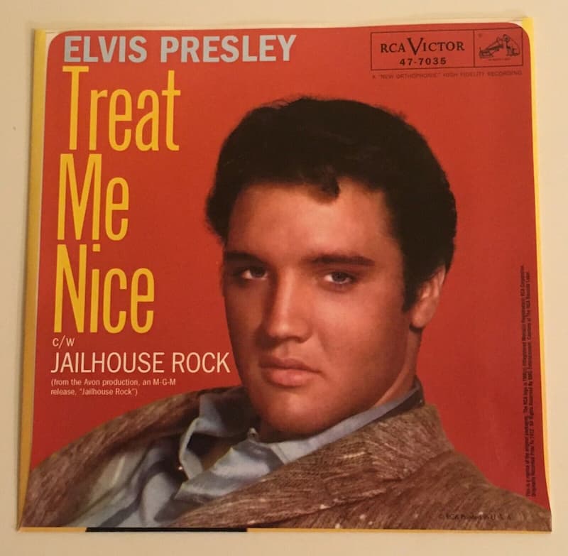 – “Treat Me Nice” was a song featured in the film Jailhouse Rock. It was the B-side to the film’s title track “Jailhouse Rock”. In the film, construction worker Vince Everett (Elvis Presley) accidentally kills a drunken, belligerent man in a barroom brawl and is sentenced to not less than 1 year in the state penitentiary for manslaughter. He serves 14 months. His cellmate is a washed-up country singer named Hunk Houghton (Mickey Shaughnessy) who was jailed for bank robbery, starts teaching Vince a few extra chords on the six-string acoustic guitar after hearing Vince sing and strum Hunk’s guitar. Hunk then convinces Vince to participate in an upcoming inmate show, which is broadcast on nationwide television. Vince receives numerous fan letters as a result; but, out of apparent jealousy, Hunk ensures they are not delivered to Vince. Hunk then convinces Vince to sign a “contract” to become equal partners in his act once both of them are out of jail. Meanwhile, during an inmate riot in the mess hall, a guard shoves Vince, who retaliates by striking the guard. As a result, the warden orders Vince to be lashed with a whip. Afterwards, it was discovered that Hunk attempted to bribe the guards to drop the punishment but had insufficient currency.